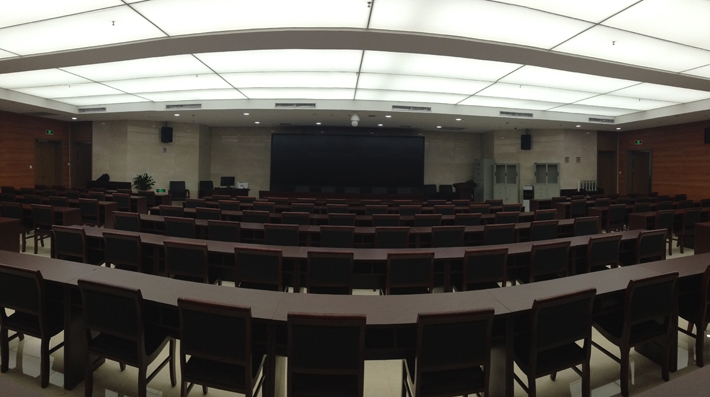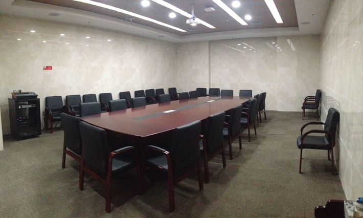 中會議室包括數(shù)字顯示系統(tǒng)、矩陣切換系統(tǒng)和專業(yè)擴(kuò)聲系統(tǒng)兩部分。結(jié)合場所大小,顯示系統(tǒng)采用5000流明投影機(jī)加120寸電動投影幕作為大屏顯示;矩陣切換采用1臺4進(jìn)4出VGA切換器;擴(kuò)聲系統(tǒng)采用6只8寸吸頂揚(yáng)聲器,1臺合并式功放。通過各設(shè)備的搭載,滿足電源智能開關(guān)、會議發(fā)言、聲畫并茂和多數(shù)量VGA信號切換等功能。